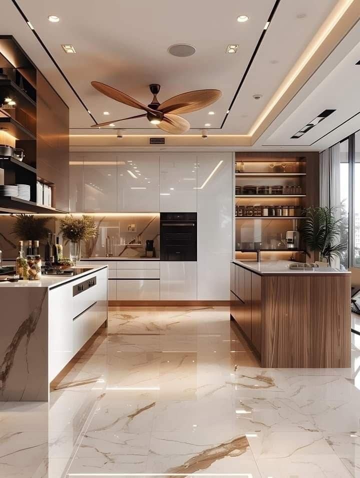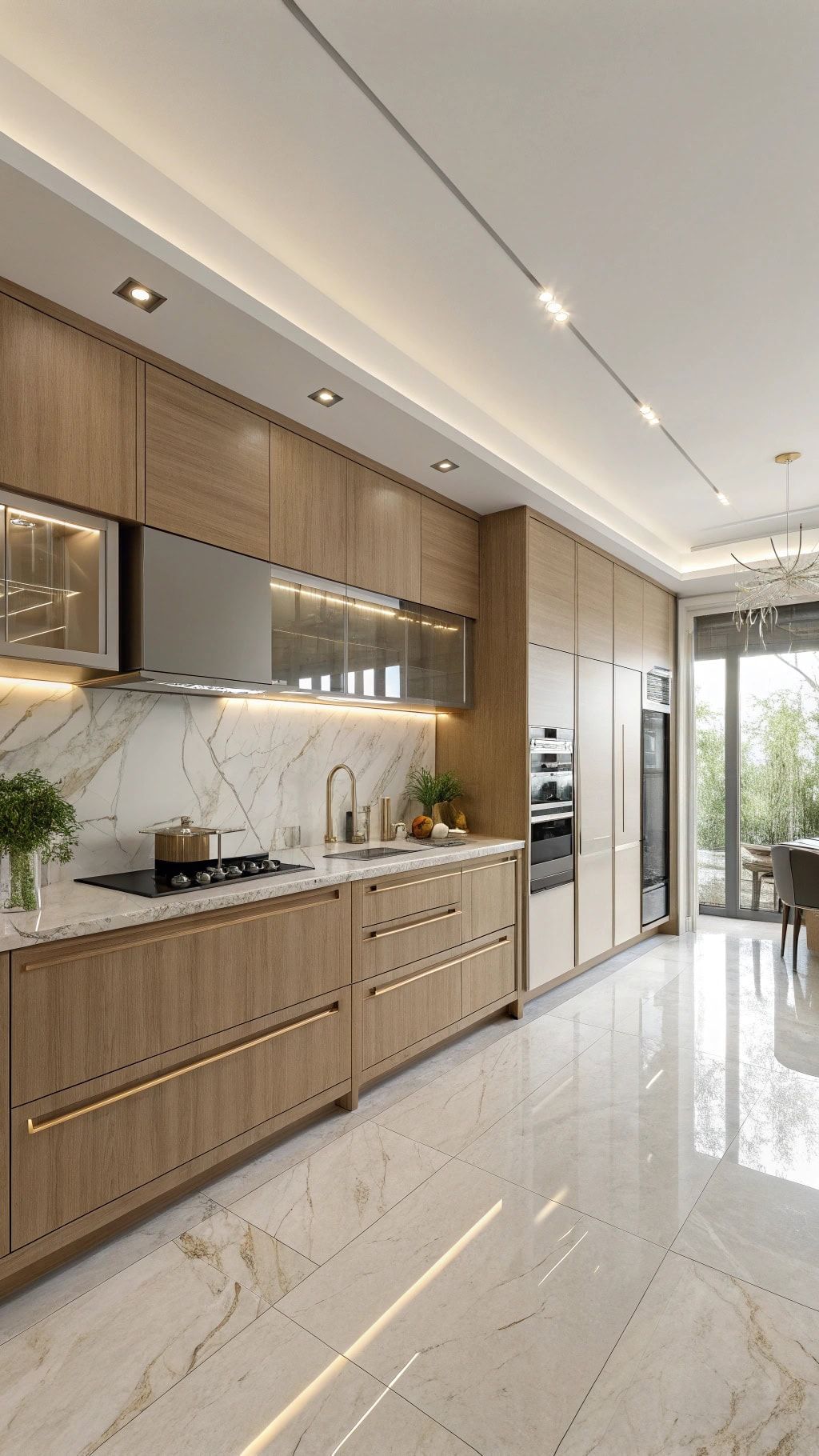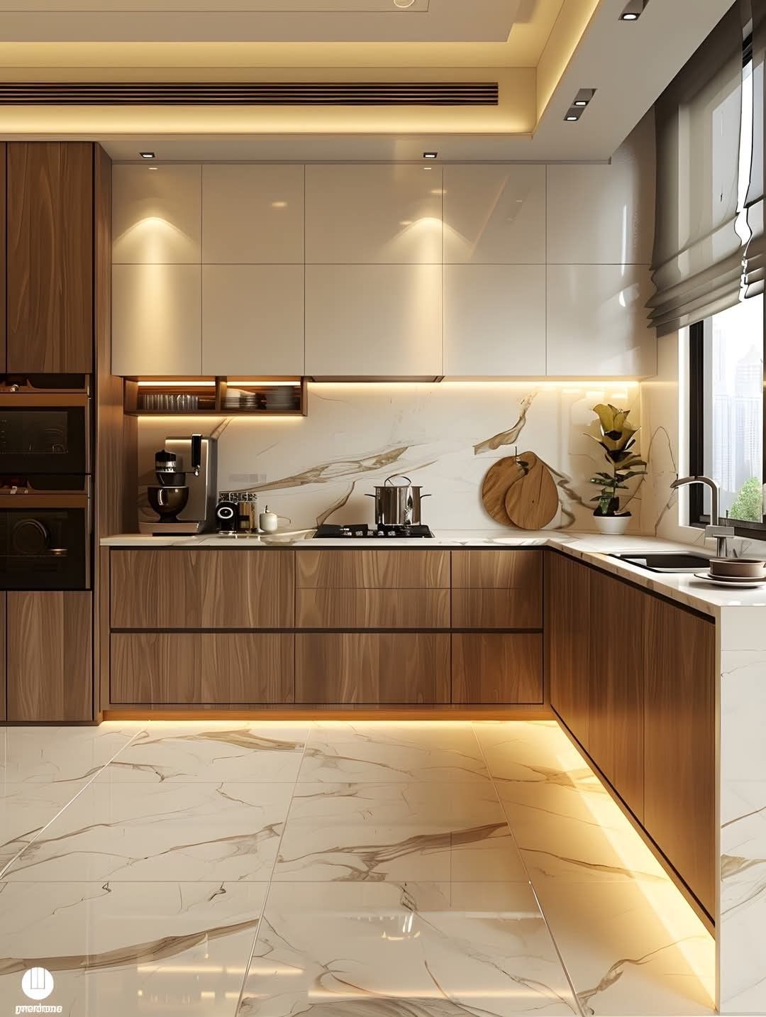 Bếp hiện đại sang trọng với gỗ óc chó và đá vân mây