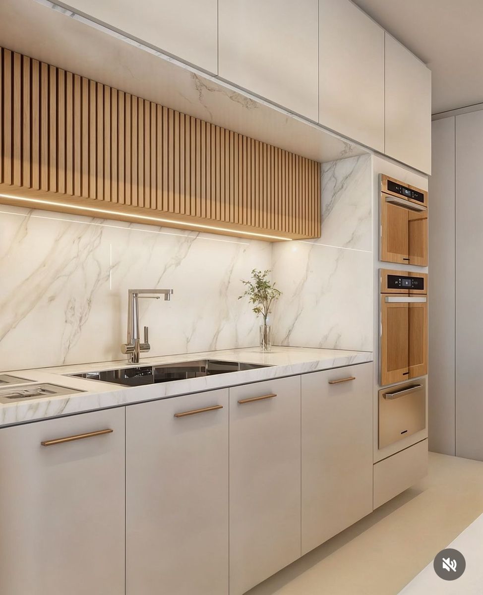 Với hệ tủ gỗ vân ngang hiện đại cùng gỗ phủ bóng tươi sáng, mẫu bếp này mang đến sự hài hòa giữa sang trọng và gần gũi. Nền gạch vân đá tự nhiên giúp tổng thể thêm phần cao cấp. Đây là lựa chọn lý tưởng cho những gia đình muốn có một gian bếp tiện nghi, sang trọng mà không quá cầu kỳ.