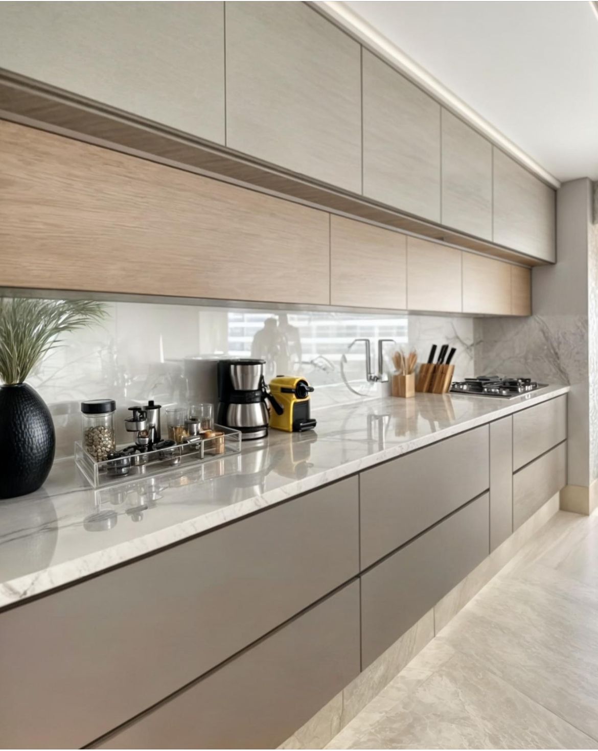 Bếp ấm áp với sự kết hợp gỗ và trắng bóng gương