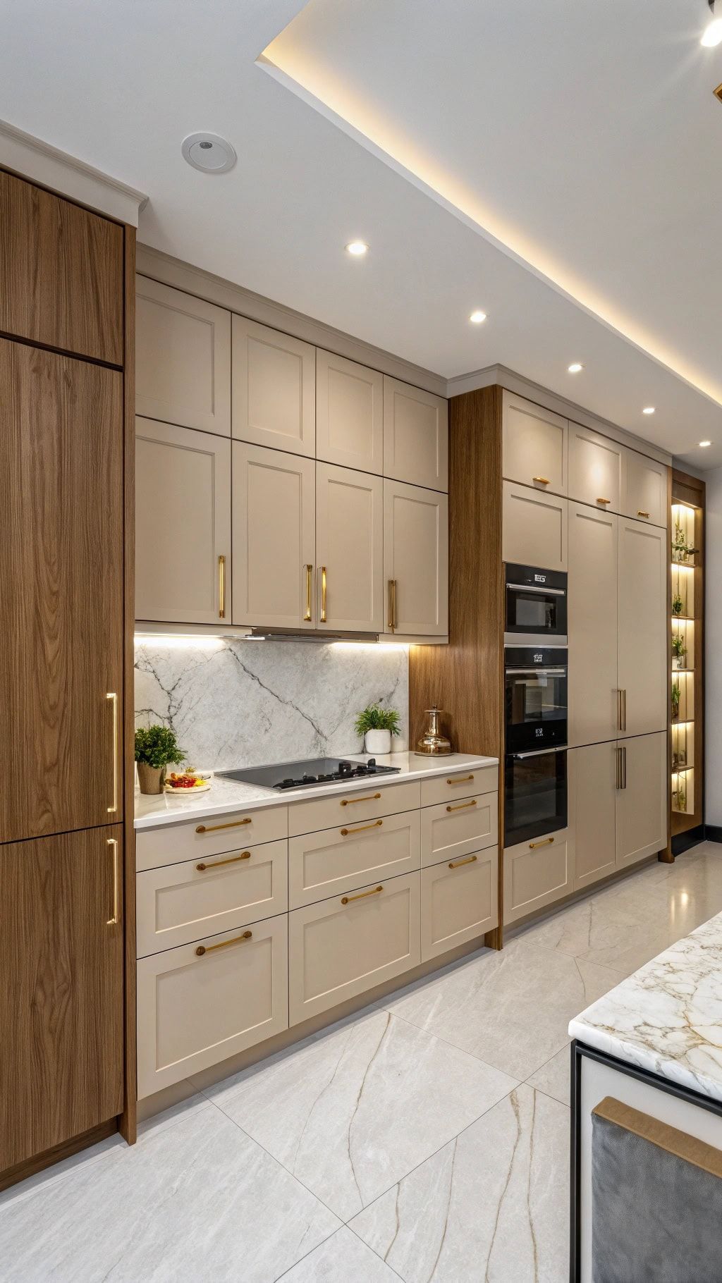 Không gian bếp sử dụng sự kết hợp giữa tủ gỗ tối màu và tủ acrylic bóng gương, cùng điểm nhấn là mặt đá vân mây trắng. Hệ thống đèn LED âm tủ tạo cảm giác sang trọng và hiện đại. Đây là lựa chọn hoàn hảo cho gia chủ yêu thích sự tinh tế nhưng vẫn muốn giữ nét ấm cúng.